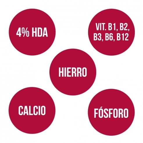 Complemento alimenticio rico en vitaminas del grupo B (B1, B2, B3, B6 y B12), hierro, fósforo y calcio, de vital importancia en los procesos metabólicos y el correcto equilibrio del organismo. Tiene un papel destacado en la estructura de los huesos, cartílagos y tejido conjuntivo.