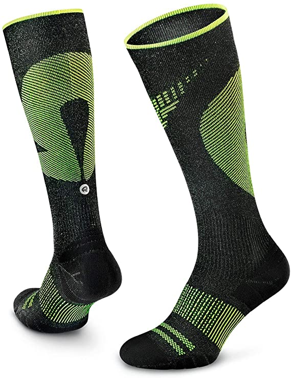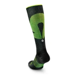 Media de compresión graduada (16–23 mmHg) Rockay Vigor en color Negro/Lima. Fabricada con 100% materiales reciclados —incluyendo nylon regenerado del océano— para running, ciclismo y recuperación activa. Anti-ampollas, anti-olor y con soporte de arco. El calcetín de compresión más sostenible del mercado.