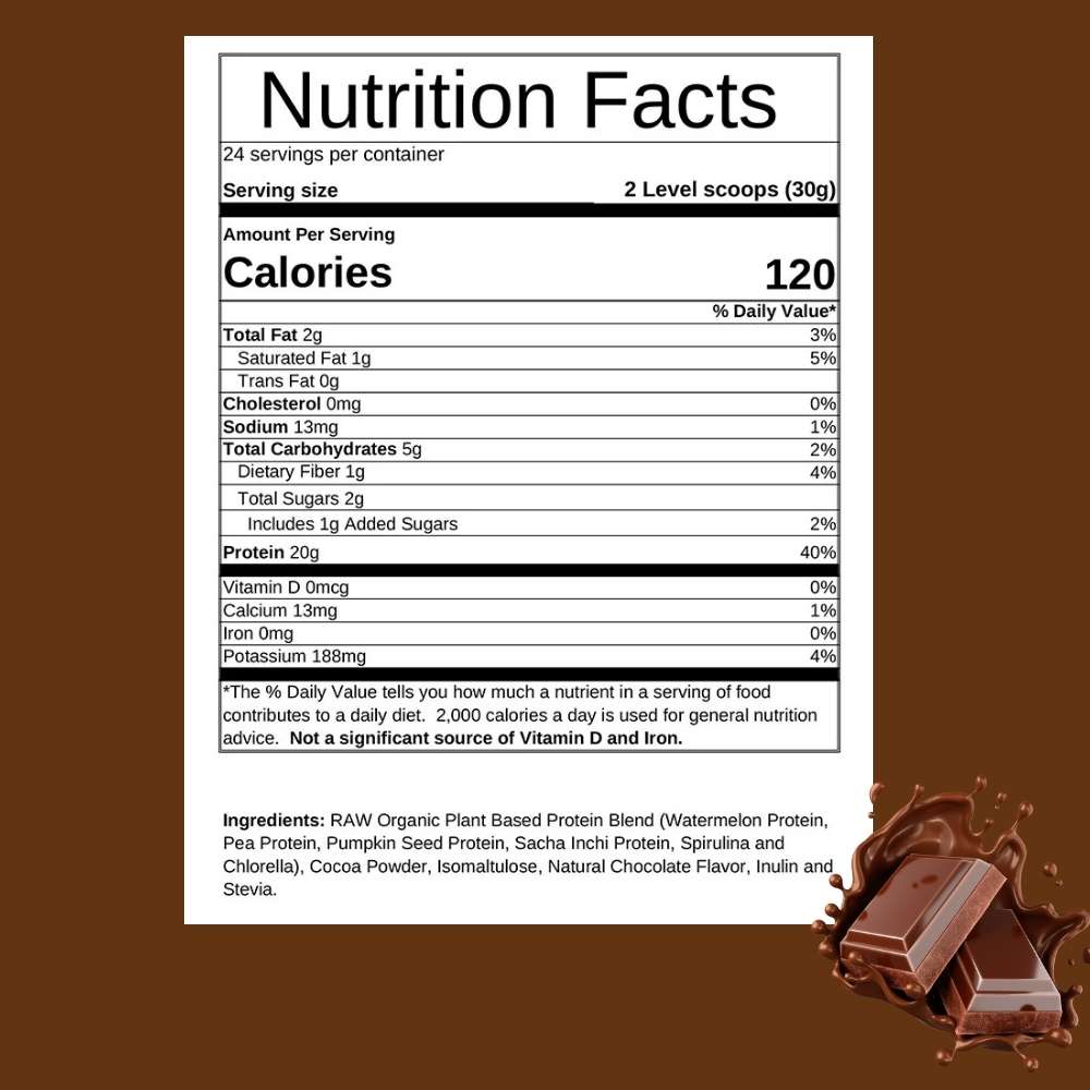 Ingredientes: Mezcla Orgánica de Proteínas Vegetales RAW (Proteína de Sandía, Proteína de Guisante, Proteína de Semilla de Calabaza, Proteína Sacha Inchi, Espirulina y Chlorella), Cacao en Polvo, Isomaltulose, Sabor Natural Chocolate, Inulina y Stevia.